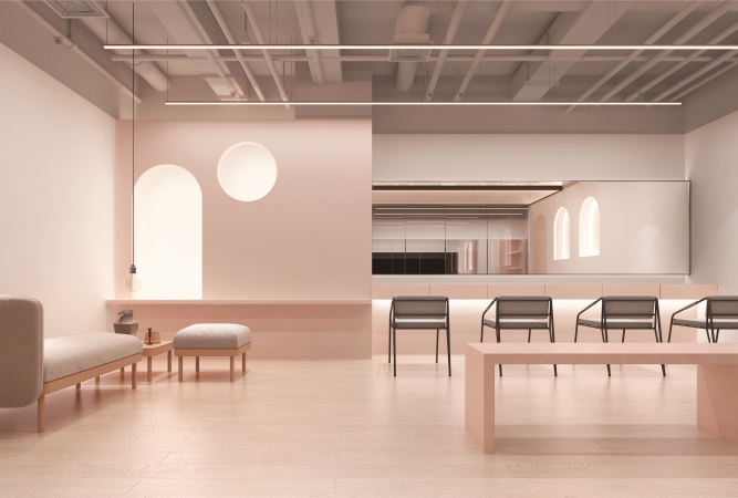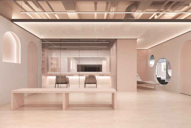 拱形與圓形的結構穿插交融在整體空間,溫暖的色彩搭配暖色的燈光,又呈現了空間的溫暖與舒適。舞蹈排練教室與微健身空間採用鏤空可移動隔斷,猶抱琵琶半遮面的凸顯了此區域的神秘感。